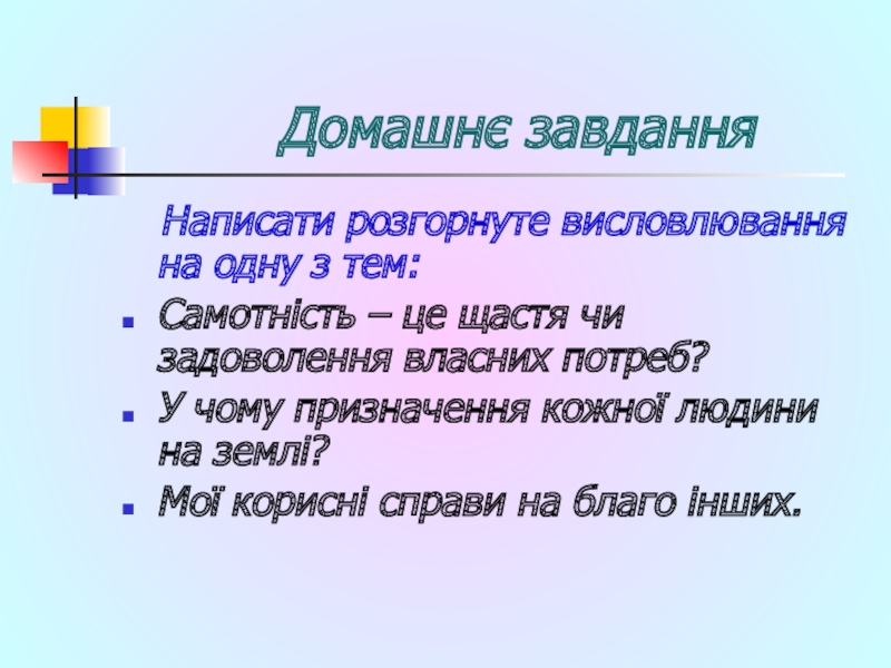 - Чи усвідомлюєш безповоротність того, до чого прагнеш, чи не боїшся самоти, чи не явиться у годину тяжких роздумів до тебе каяття?