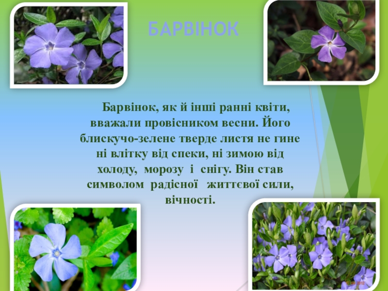 Барвінок, як й інші ранні квіти, вважали провісником весни. Його блискучо-зелене тверде листя не гине ні влітку від спеки, ні зимою від холоду, морозу і снігу. Він став символом радісної життєвої сили, вічності.
