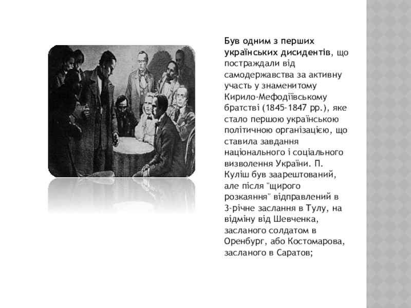 активну участь у знаменитому Кирило-Мефодіївському братстві (1845-1847 рр.), яке стало першою українською політичною організацією, що ставила завдання національного і соціального визволення України. П. Куліш був заарештований, але після "щирого розкаяння" відправлений в 3-річне заслання в Тулу, на відміну від Шевченка, засланого солдатом в Оренбург, або Костомарова, засланого в Саратов;
