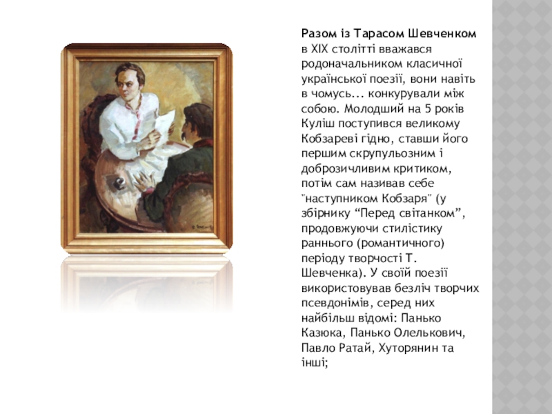 Слайд 6Разом із Тарасом Шевченком в XIX столітті вважався родоначальником класичної української