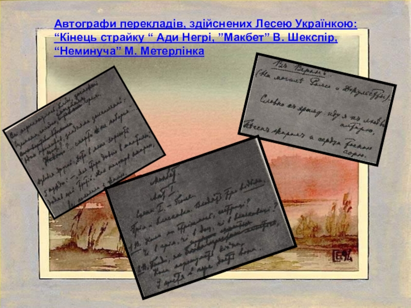 Автографи перекладів, здійснених Лесею Українкою: “Кінець страйку “ Ади Негрі, ”Макбет” В. Шекспір, “Неминуча” М. Метерлінка
