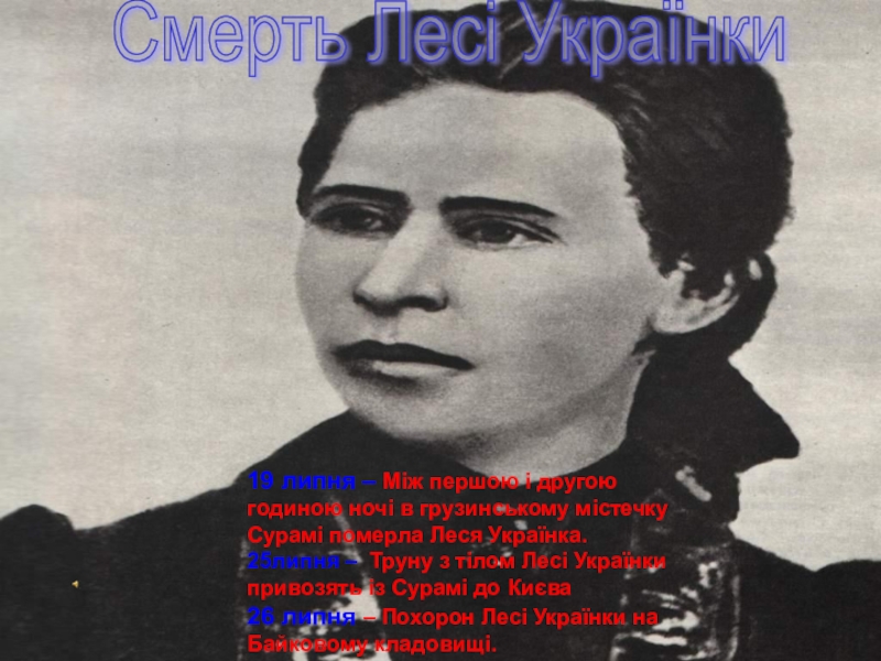 19 липня – Між першою і другою годиною ночі в грузинському містечку Сурамі померла Леся Українка. 25липня – Труну з тілом Лесі Українки привозять із Сурамі до Києва 26 липня – Похорон Лесі Українки на Байковому кладовищі.