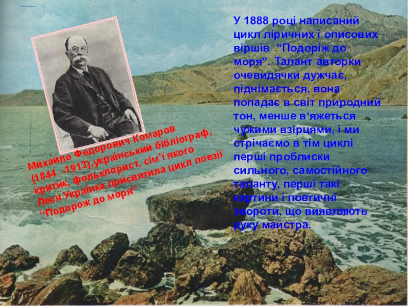 Михайло Федорович Комаров (1844 -1913),український бібліограф, критик, фольклорист, сім’ї якого Леся Українка присвятила цикл поезії “Подорож до моря”