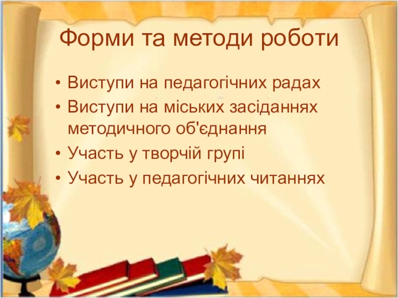 Форми та методи роботиВиступи на педагогічних радахВиступи на міських засіданнях методичного об'єднанняУчасть у творчій групіУчасть у педагогічних