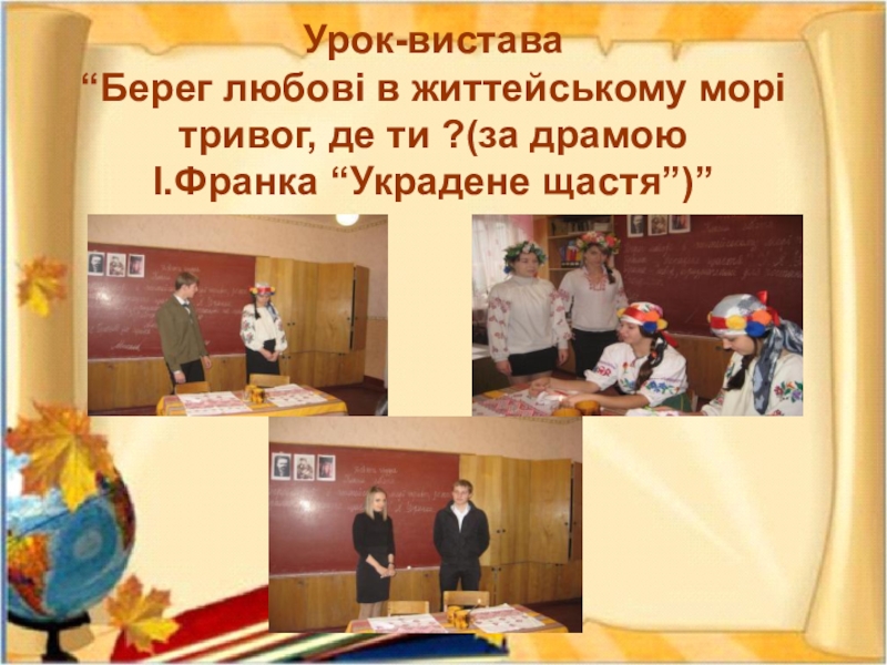 Урок-вистава “Берег любові в життейському морі тривог, де ти ?(за драмою І.Франка “Украдене щастя”)”