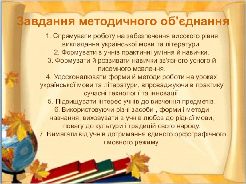 Завдання методичного об'єднання1. Спрямувати роботу на забезпечення високого рівня викладання української мови та літератури.2. Формувати в учнів практичні уміння й навички.3. Формувати й розвивати навички зв'язного усного й писемного мовлення.4. Удосконалювати форми й методи роботи на