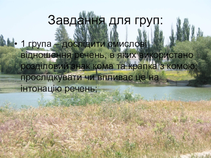Завдання для груп:1 група – дослідити смислові відношення речень, в яких використано розділовий знак кома та крапка