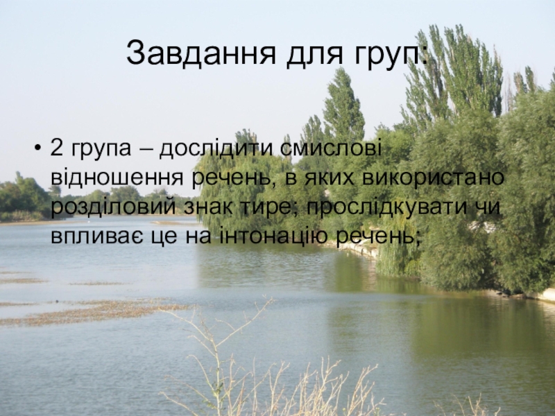 Завдання для груп:2 група – дослідити смислові відношення речень, в яких використано розділовий знак тире; прослідкувати чи