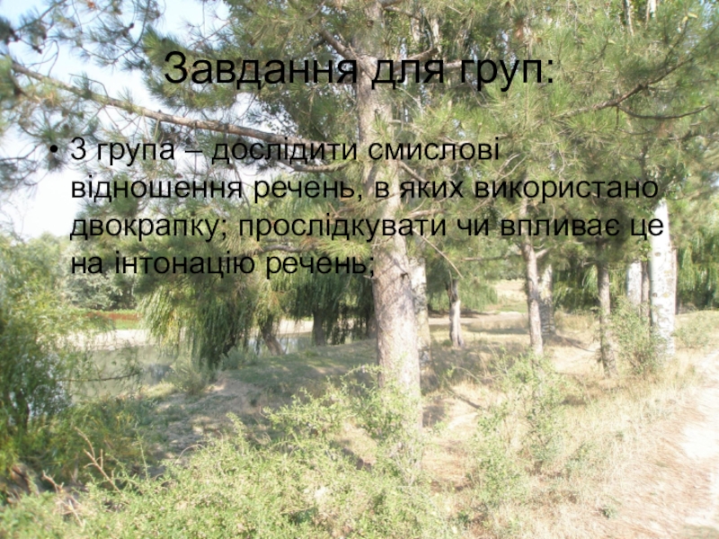 Завдання для груп:3 група – дослідити смислові відношення речень, в яких використано двокрапку; прослідкувати чи впливає це
