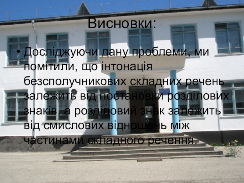 Висновки:Досліджуючи дану проблеми, ми помітили, що інтонація безсполучникових складних речень залежить від постановки розділових знаків, а розділовий