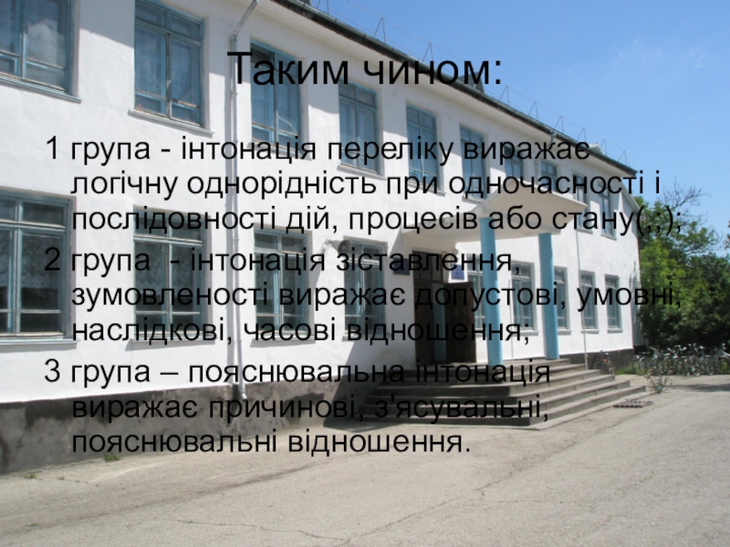 3 група – пояснювальна інтонація виражає причинові, з'ясувальні, пояснювальні відношення.