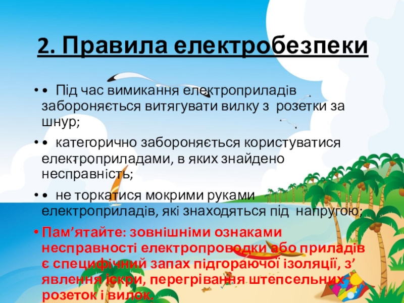 Пам’ятайте: зовнiшнiми ознаками несправностi електропроводки або приладiв є специфiчний запах пiдгораючої iзоляції, з’явлення іскри, перегрівання штепсельних розеток i вилок.