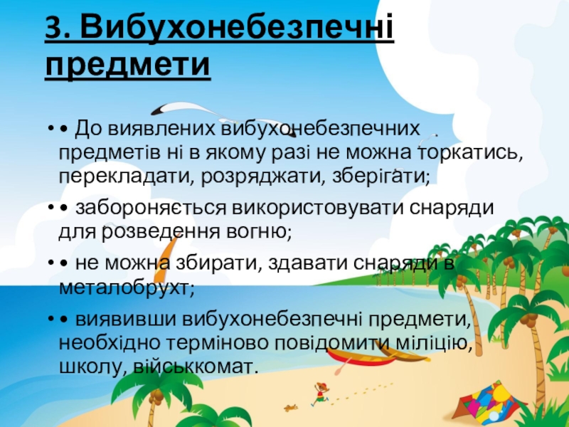 • виявивши вибухонебезпечнi предмети, необхiдно термiново повiдомити мiлiцiю, школу, вiйськкомат.