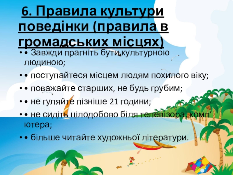 Слайд 7 6. Правила культури поведінки (правила в громадських місцях)
