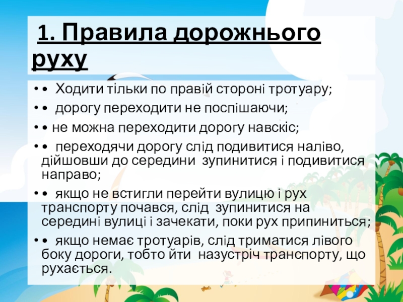 • якщо немає тротуарiв, слiд триматися лiвого боку дороги, тобто йти назустріч транспорту, що рухається.