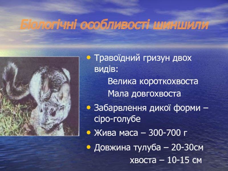 Біологічні особливості шиншилиТравоїдний гризун двох видів: Велика короткохвоста Мала довгохвостаЗабарвлення дикої форми – сіро-голубеЖива маса – 300-700 гДовжина тулуба – 20-30см хвоста –