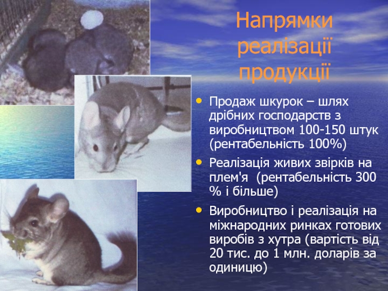 Напрямки реалізації продукціїПродаж шкурок – шлях дрібних господарств з виробництвом 100-150 штук (рентабельність 100%)Реалізація живих звірків на