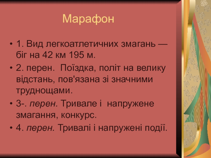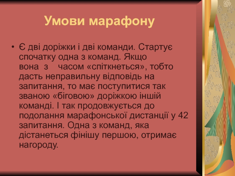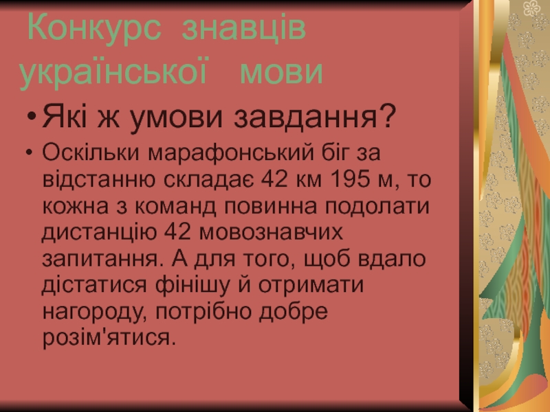 Оскільки марафонський біг за відстанню складає 42 км 195 м, то кожна з команд повинна подолати дистанцію 42 мовознавчих запитання. А для того, щоб вдало дістатися фінішу й отримати нагороду, потрібно добре розім'ятися.