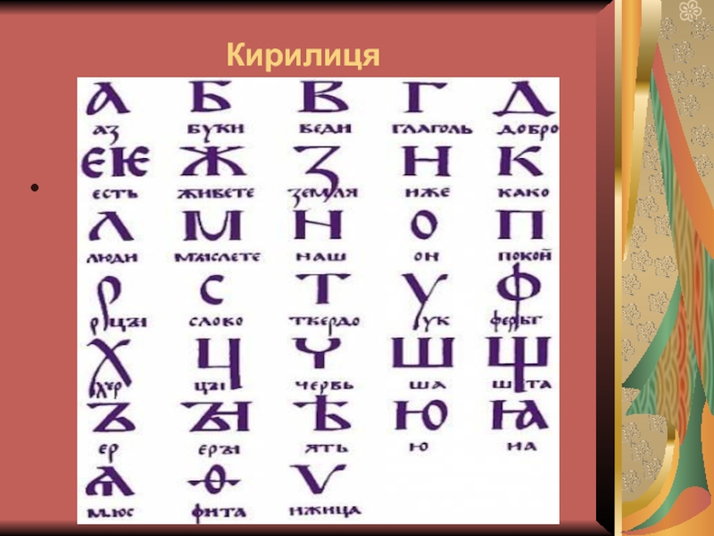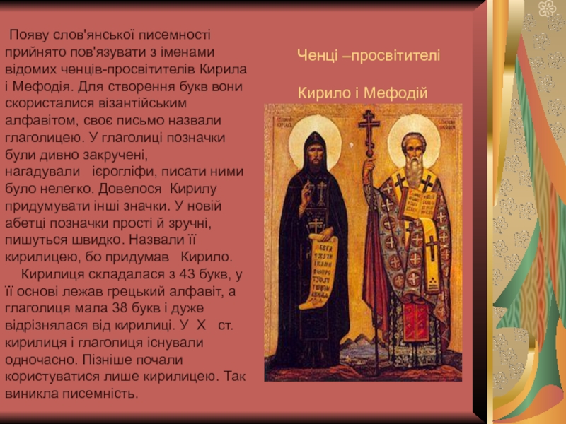 Появу слов'янської писемності прийнято пов'язувати з іменами відомих ченців-просвітителів Кирила і Мефодія. Для створення букв вони скористалися візантійським алфавітом, своє письмо назвали глаголицею. У глаголиці позначки були дивно закручені, нагадували ієрогліфи, писати ними було нелегко. Довелося Кирилу придумувати інші значки. У новій абетці позначки прості й зручні, пишуться швидко. Назвали її кирилицею, бо придумав Кирило.