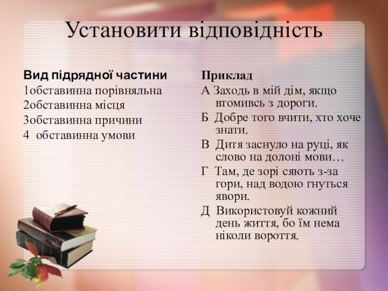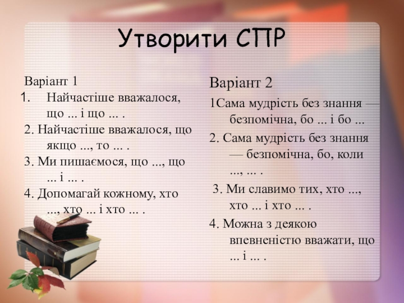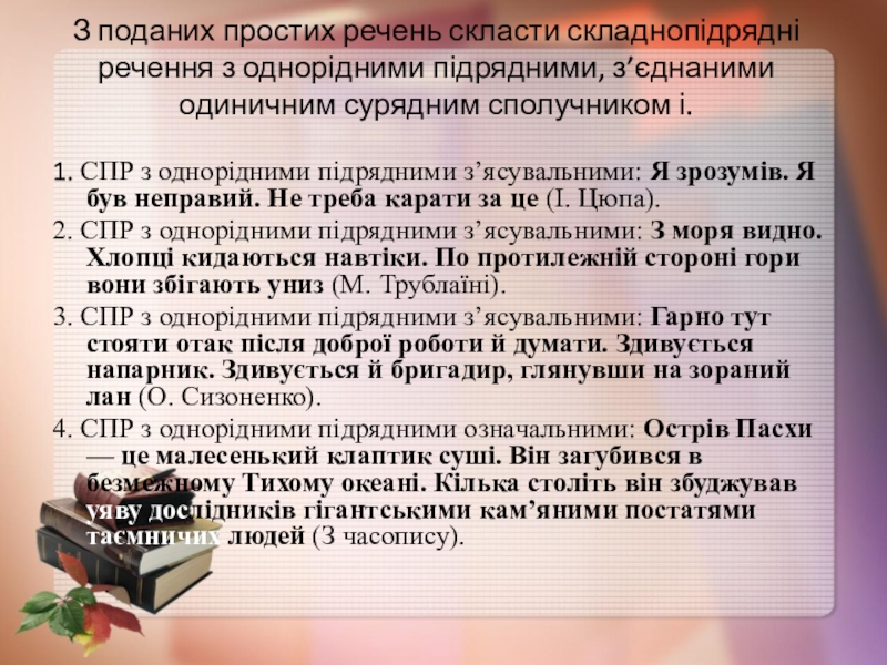 3. СПР з однорідними підрядними з’ясувальними: Гарно тут стояти отак після доброї роботи й думати. Здивується напарник. Здивується й бригадир, глянувши на зораний лан (О. Сизоненко).
