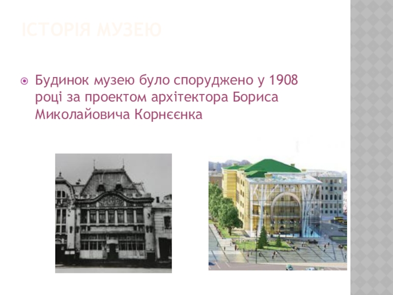 ІСТОРІЯ МУЗЕЮ Будинок музею було споруджено у 1908 році за проектом архітектора Бориса Миколайовича Корнєєнка