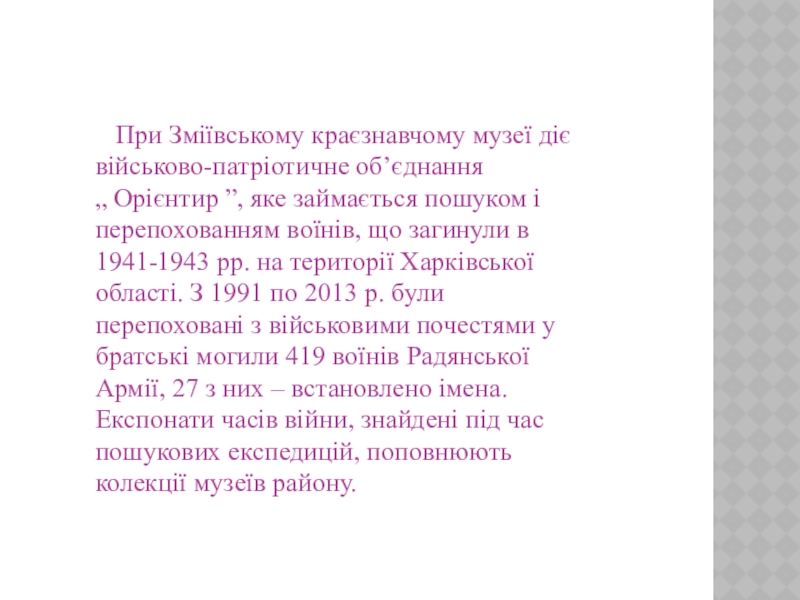 Слайд 14 При Зміївському краєзнавчому музеї діє військово-патріотичне об’єднання