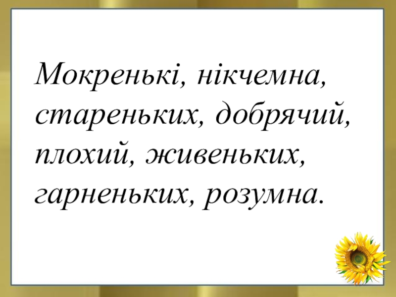 Мокренькі, нікчемна, стареньких, добрячий, плохий, живеньких, гарненьких, розумна.