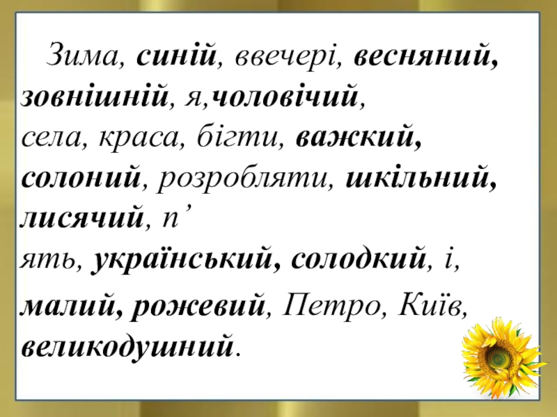 зовнішній, я,чоловічий,села, краса, бігти, важкий, солоний, розробляти, шкільний, лисячий, п’ять, український, солодкий, і,