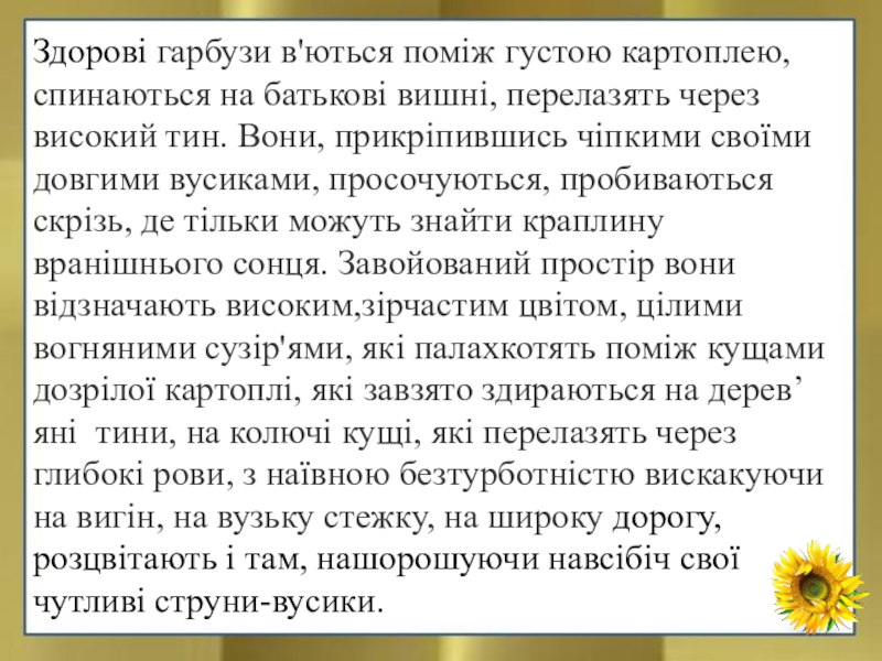 Слайд 6Здорові гарбузи в'ються поміж густою картоплею, спинаються на батькові вишні, перелазять