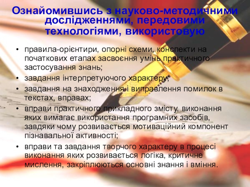 Слайд 9Ознайомившись з науково-методичними дослідженнями, передовими технологіями, використовую