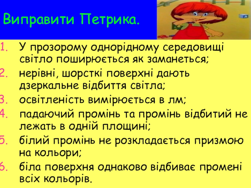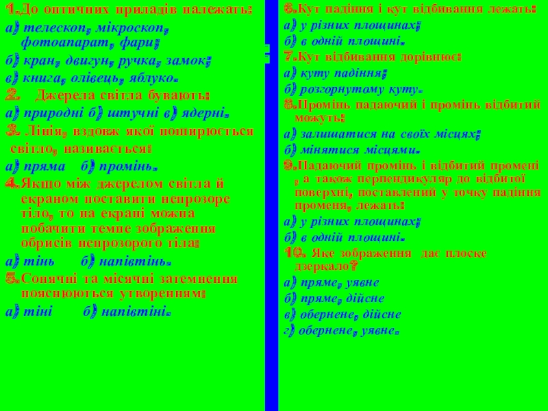9.Падаючий промінь і відбитий промені , а також перпендикуляр до відбитої поверхні, поставлений у точку падіння променя, лежать:
