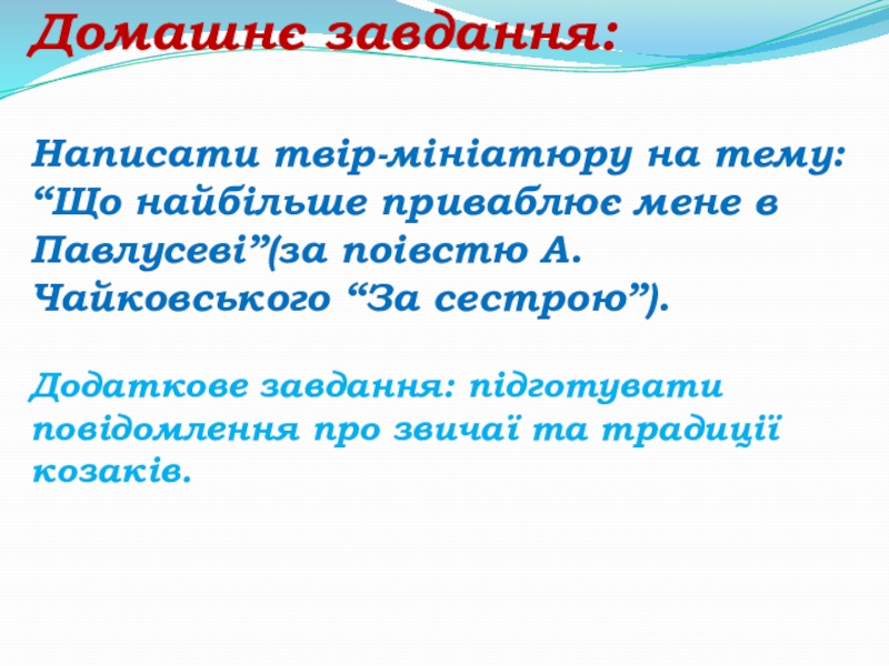Домашнє завдання:  Написати твір-мініатюру на тему: “Що найбільше приваблює мене в Павлусеві”(за поівстю А.Чайковського “За