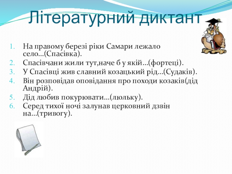 Літературний диктантНа правому березі ріки Самари лежало село…(Спасівка).Спасівчани жили тут,наче б у якій…(фортеці). У Спасівці жив славний
