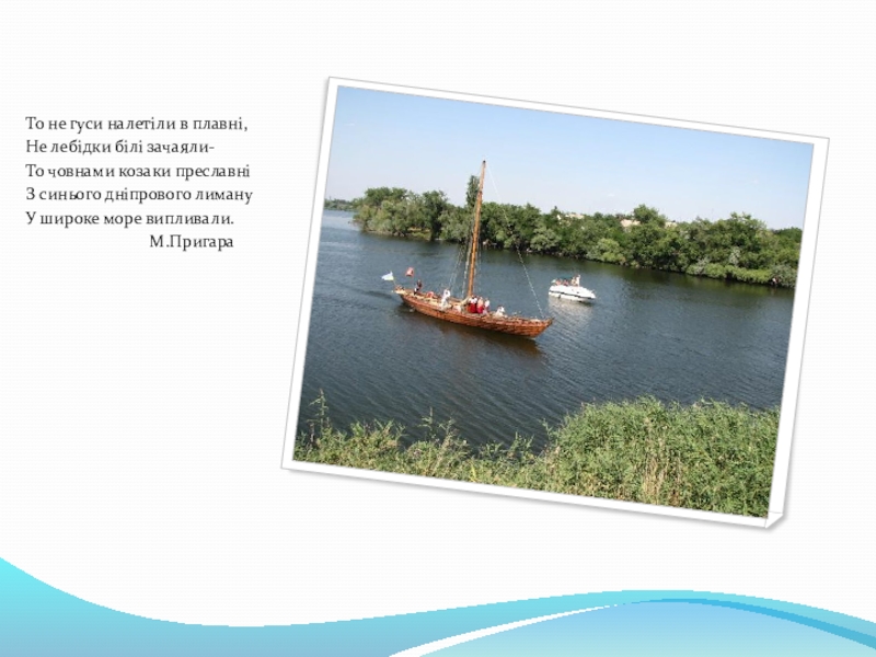 То не гуси налетіли в плавні,Не лебідки білі зачаяли-То човнами козаки преславніЗ синього дніпрового лимануУ широке море