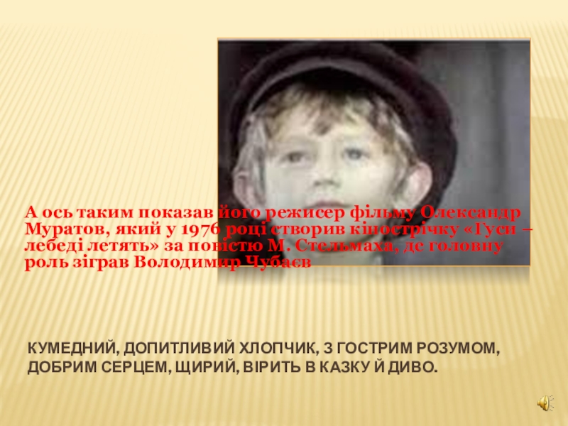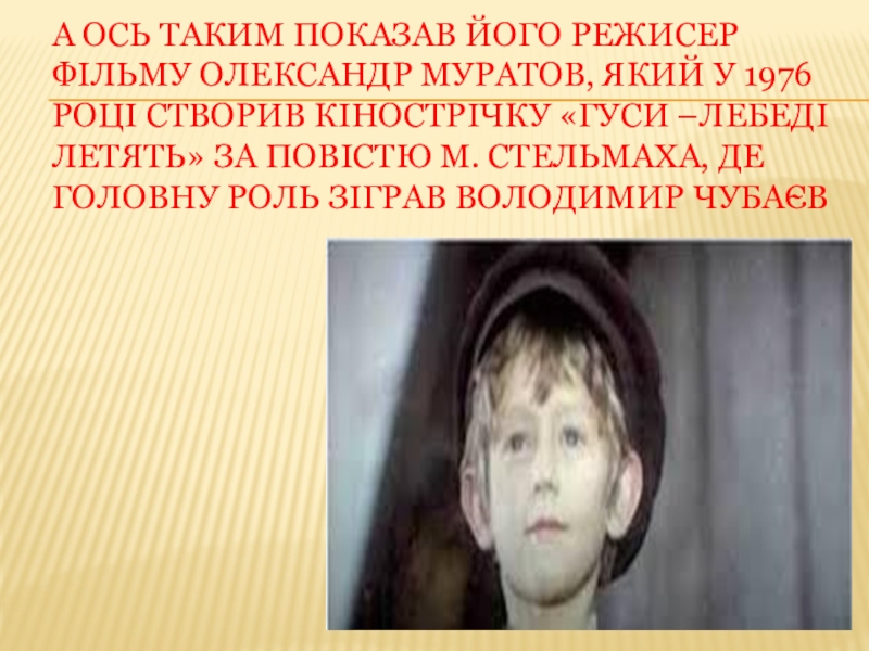 А ось таким показав його режисер фільму Олександр Муратов, який у 1976 році створив кінострічку «Гуси –лебеді летять» за повістю М. Стельмаха, де головну роль зіграв Володимир Чубаєв