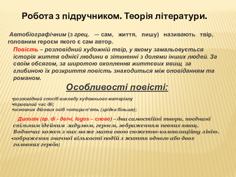 Повість – розповідний художній твір, у якому замальовується історія життя однієї людини в зіткненні з долями інших людей. За своїм обсягом, за широтою охоплення життєвих явищ за глибиною їх розкриття повість знаходиться між оповіданням та романом.