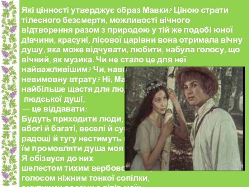 Слайд 13Які цінності утверджує образ Мавки? Ціною страти тілесного безсмертя, можливості вічного