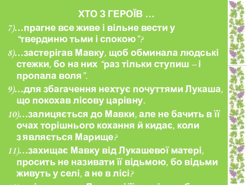 8)…застерігав Мавку, щоб обминала людські стежки, бо на них “раз тільки ступиш – і пропала воля”.