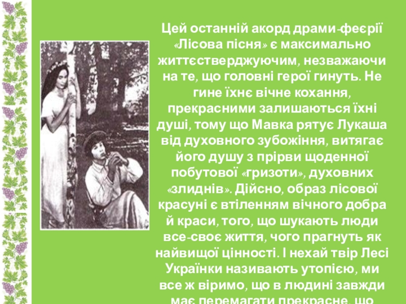 Слайд 14Цей останній акорд драми-феєрії «Лісова пісня» є максимально життєстверджуючим, незважаючи на