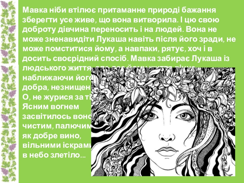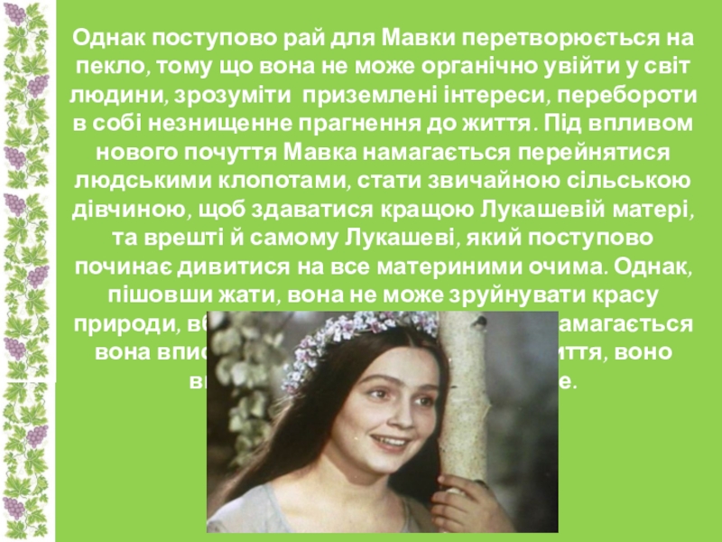 Слайд 12Мавка ніби втілює притаманне природі бажання зберегти усе живе, що вона