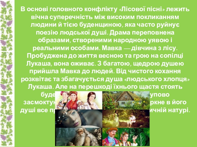 покликанням людини й тією буденщиною, яка часто руйнує поезію людської душі. Драма переповнена образами, створеними народною уявою і реальними особами. Мавка — дівчина з лісу. Пробуджена до життя весною та грою на сопілці Лукаша, вона оживає. З багатою, щедрою душею прийшла Мавка до людей. Від чистого кохання розквітає та збагачується душа «людського хлопця» Лукаша. Але на перешкоді їхнього щастя стоять буденні людські клопоти, які поступово засмоктують у своє болото Лукаша. Меркне в його душі все прекрасне, властиве його поетичній натурі.