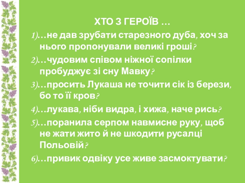 3)…просить Лукаша не точити сік із берези, бо то її кров?