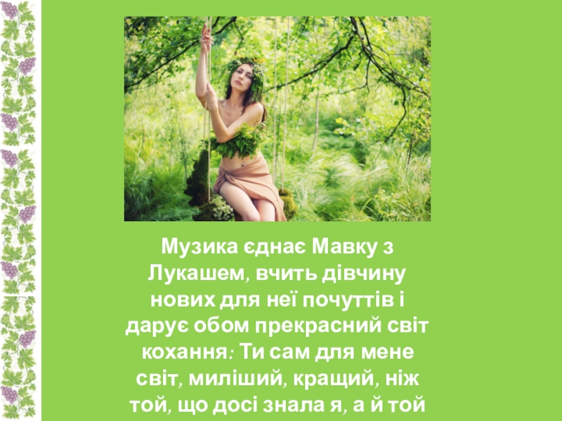 Слайд 10Музика єднає Мавку з Лукашем, вчить дівчину нових для неї почуттів