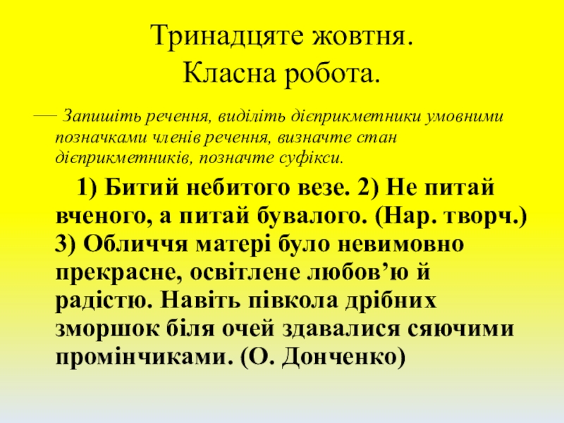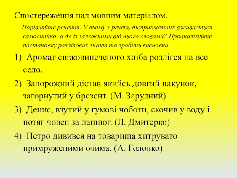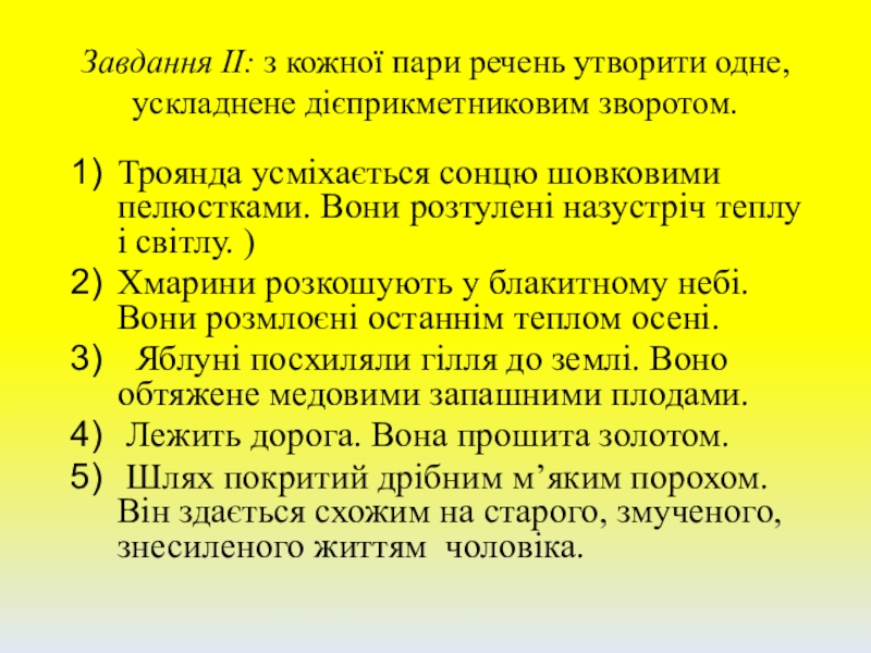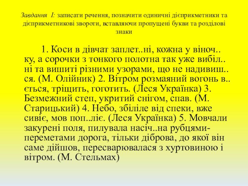 1. Коси в дівчат заплет..ні, кожна у віноч..ку, а сорочки з тонкого полотна так уже вибіл..ні та вишиті різними узорами, що не надивиш..ся. (М. Олійник) 2. Вітром розмаяний вогонь в..ється, тріщить, гоготить. (Леся Українка) 3. Безмежний степ, укритий снігом, спав. (М. Старицький) 4. Небо, збіліле від спеки, вже сивіє, мов поп..ліє. (Леся Українка) 5. Мовчали закурені поля, пилувала насіч..на рубцями-переметами дорога, тільки діброва, до якої він саме дійшов, пересварювалася з хуртовиною і вітром. (М. Стельмах)