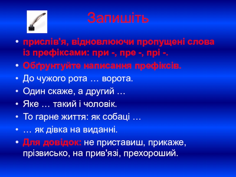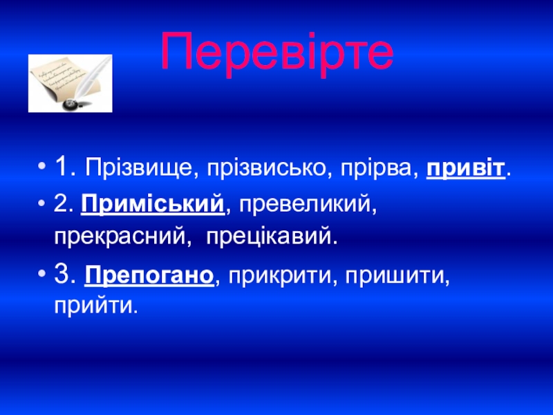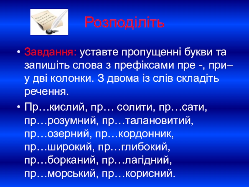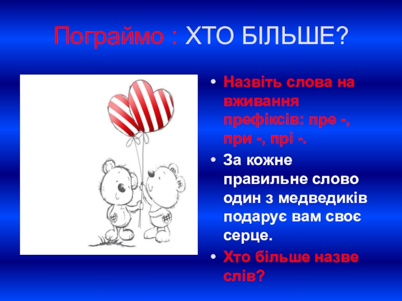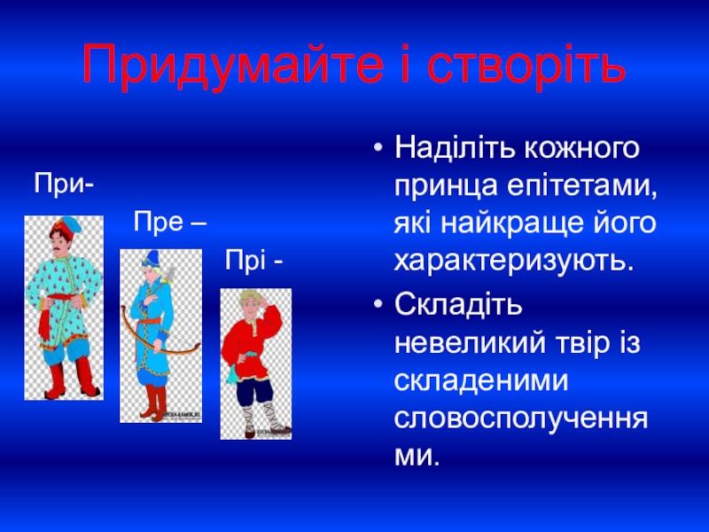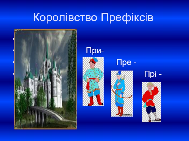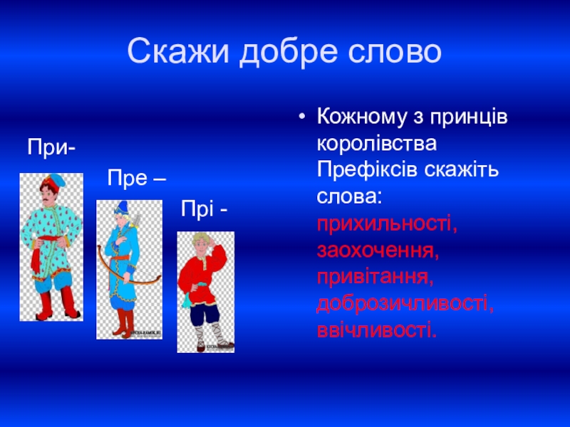 Кожному з принців королівства Префіксів скажіть слова: прихильності, заохочення, привітання, доброзичливості, ввічливості.