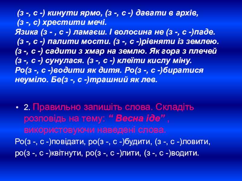 2. Правильно запишіть слова. Складіть розповідь на тему: “ Весна іде” , використовуючи наведені слова.