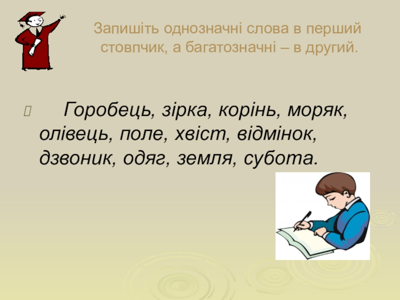 Горобець, зірка, корінь, моряк, олівець, поле, хвіст, відмінок, дзвоник, одяг, земля, субота.
