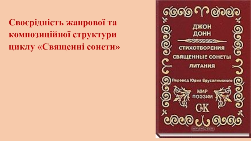 «Жанровою специфікою “Священних сонетів” є синтез “світських” і “релігійних” жанрів. Жанровою матрицею для сонетів Джона Донна слугували сонети і молитви.
