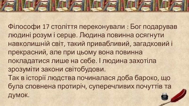 Слайд 8Філософи 17 століття переконували : Бог подарував людині розум і серце.