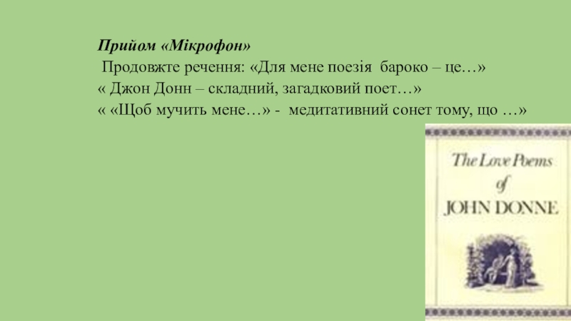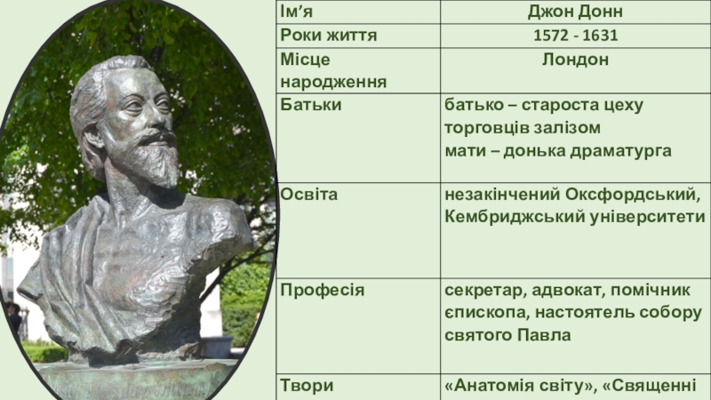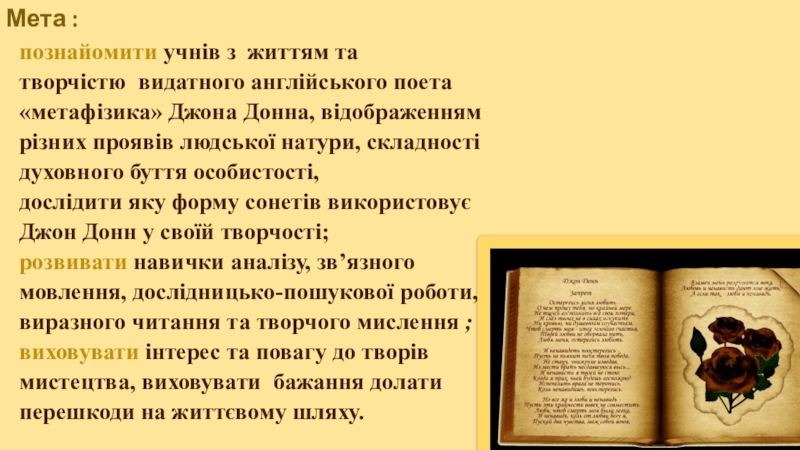 познайомити учнів з життям та творчістю видатного англійського поета «метафізика»